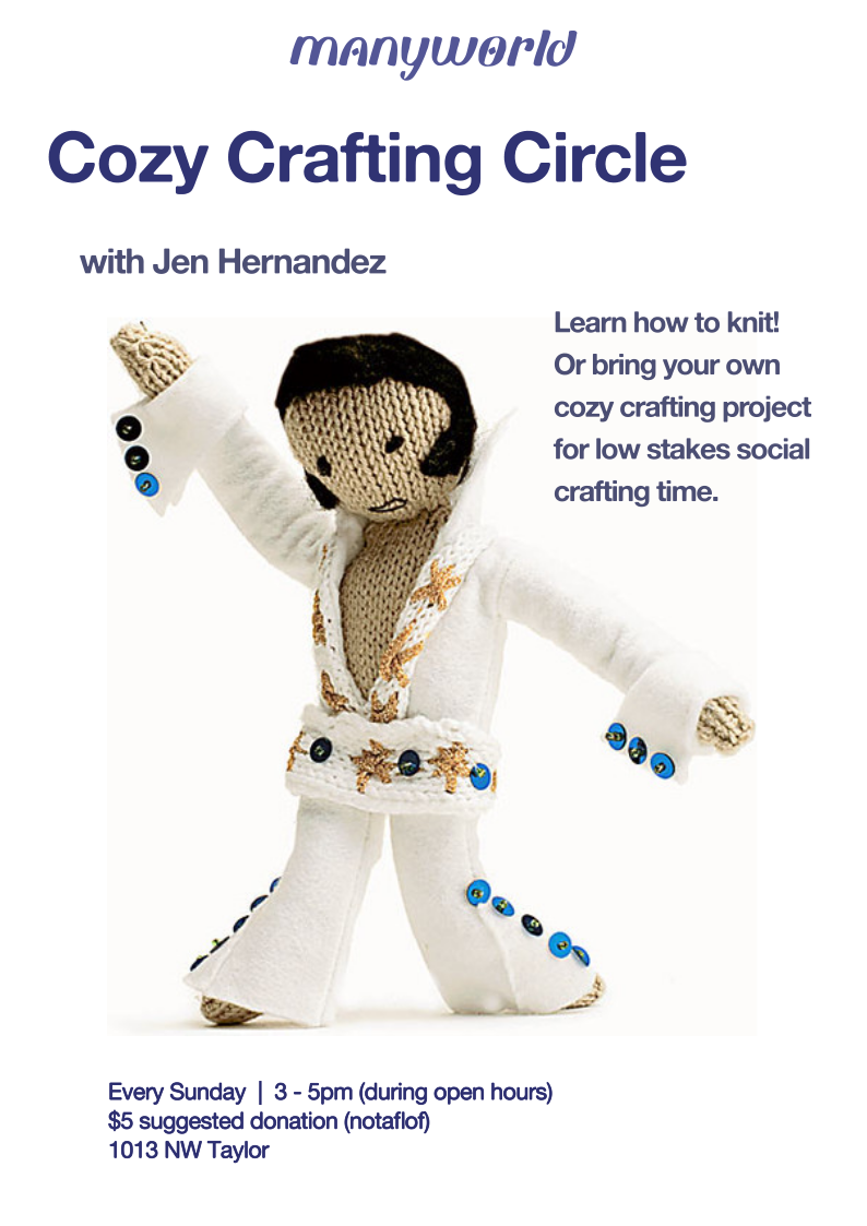 A weekly knitting circle every Sunday, 3-5pm. No experience necessary. Bring your knitting, crocheting, or other cozy craft projects for a social crafting gathering. Come learn basic knitting skills too! Held and taught by Jen Hernandez (https://jenhernandezart.com/).