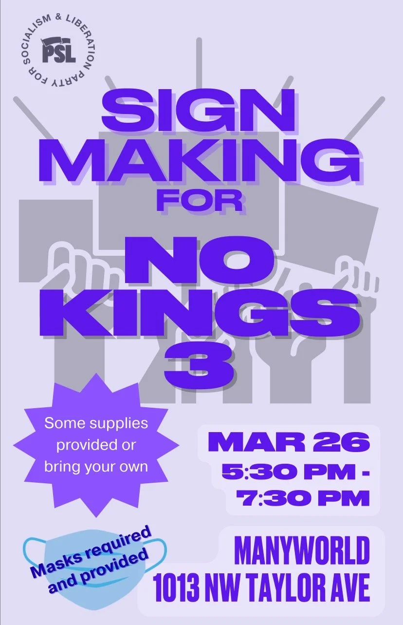 Protest Sign Making Thursday, March 26, 2026 5:30 PM 7:30 PM 1013 NW Taylor Ave. Corvallis, OR, 97330 USA (map) Google Calendar ICS